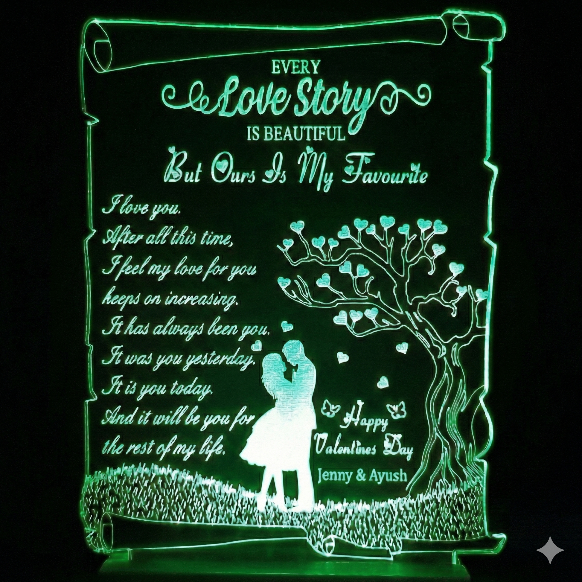 Introducing our captivating Love Tree Scroll Personalised Luminous Lamp—a radiant symbol of love. With seven enchanting lighting colors, this unique lamp features a couple under a heart-adorned tree, making it a perfect Valentine's Day gift.