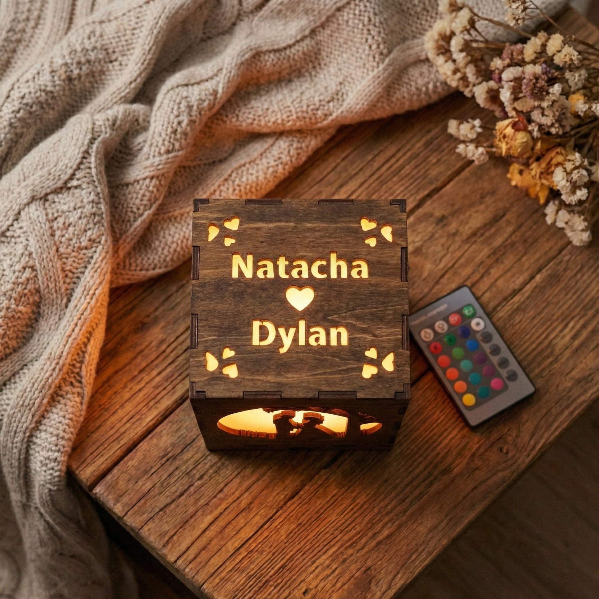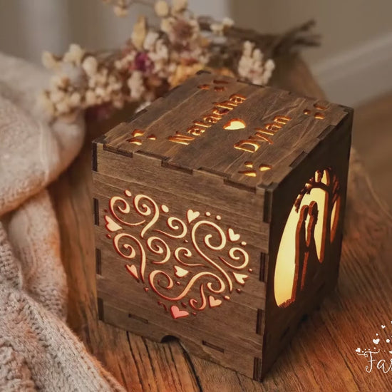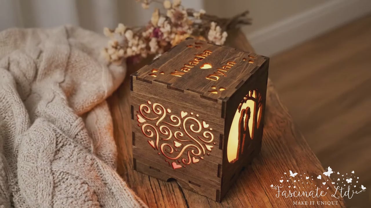 Celebrate love with this exquisite wooden lamp box, featuring a unique design of a romantic couple standing under a beautifully detailed tree.
